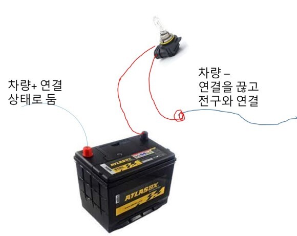 - 위 그림과 같이 배터리에서 (-)를 분리하고 전구와 연결함