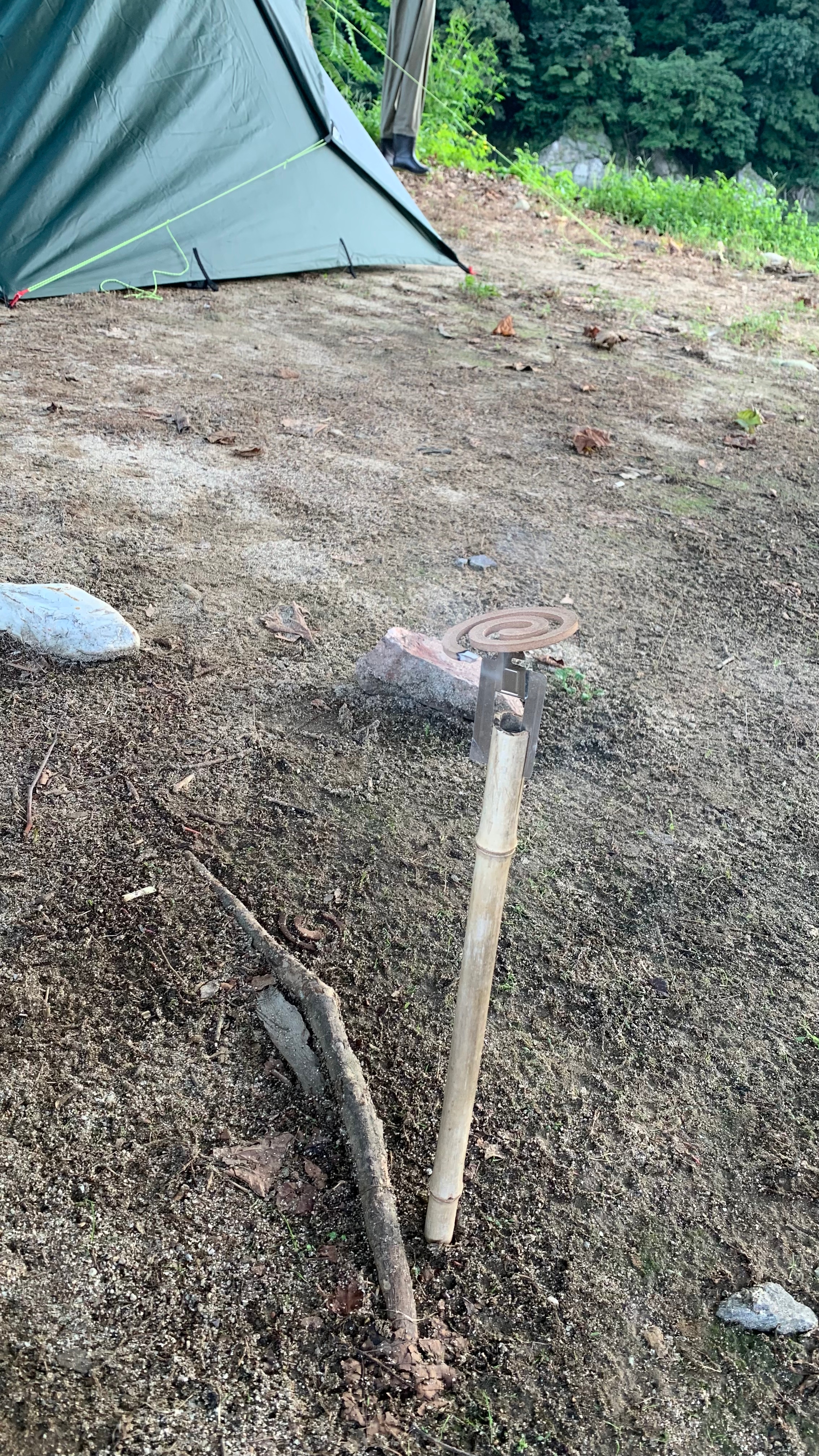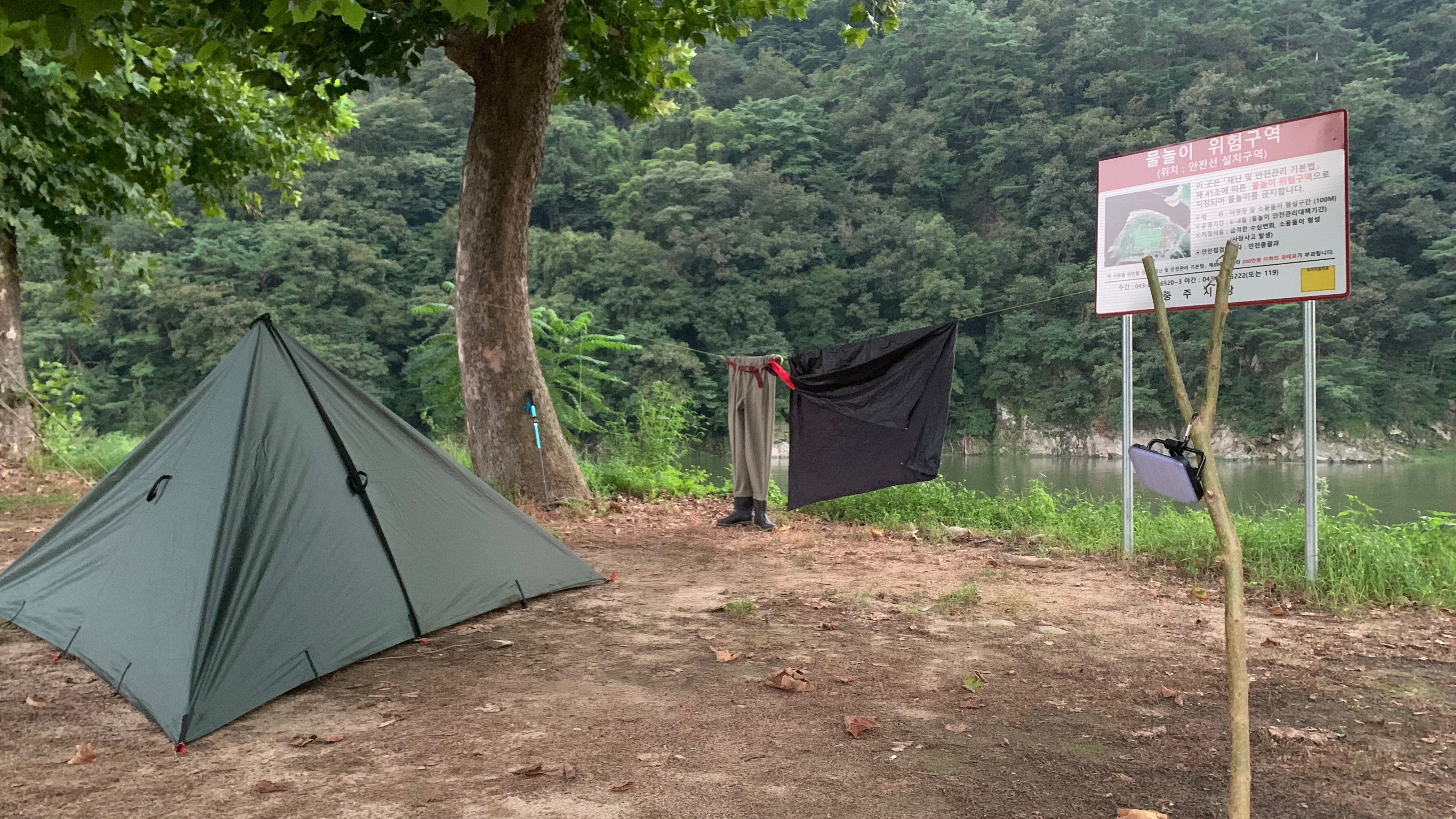 마지막 사진은 타프로 만든 티피셀터 와, 잠깐 쏘가리 낚시 하고 와서 말려 놓은 웨이더가 있네요..